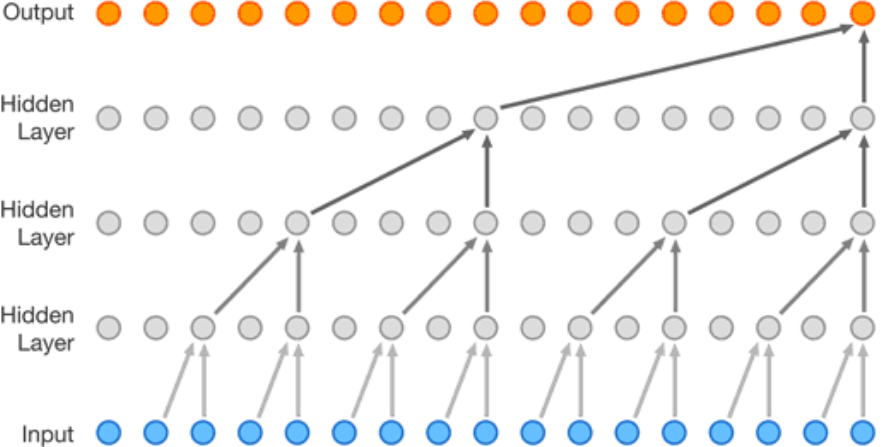 如图所示,WaveNet 就是一群卷积神经网络组成的预测模型,通过历史数据预测下一个点。
